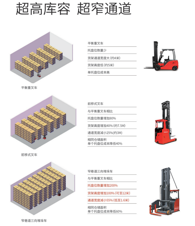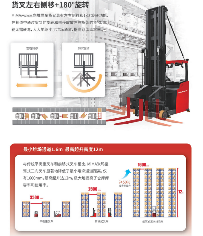 MC系列窄通道三向堆垛車能節(jié)約通道面積,利用面積與高度優(yōu)勢(shì),顯著增加庫(kù)容量。