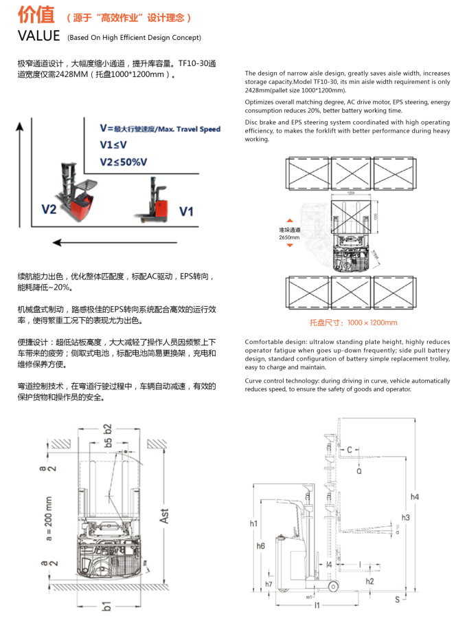 11. 整車轉(zhuǎn)彎半徑為1480mm,以1200×1200mm托盤為例,在保證200mm安全距離的前提下,其最小堆垛通道寬度為2630mm,在窄巷道載貨作業(yè)上具有很大的優(yōu)勢。